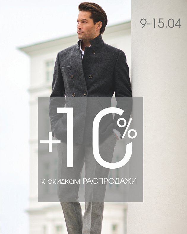 На мужские коллекции с назначенными скидками ВЕСЕННЕЙ РАСПРОДАЖИ действует ДОПОЛНИТЕЛЬНАЯ ПОСЛЕДОВАТЕЛЬНАЯ СКИДКА 10%.